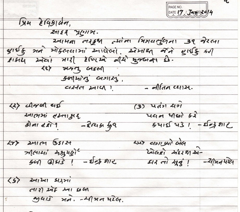 જાણ માટેઃ કવિ શ્રી યોસેફ મેકવાને, સાહિત્ય સરિતાના સભ્યોના પસંદ કરેલા હાઈકુ તેમના જ અક્ષરોમાંઃ